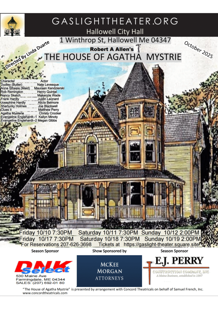 Gaslight Theater presents the cast for “The House of Agatha Mystrie”, by Robert A. Allen. The production will be directed by Linda Duarte. Show dates are October 10, 11, 12, 17, 18, and 19, 2025. Fridays and Saturdays at 7:30 PM Sundays at 2:00PM
