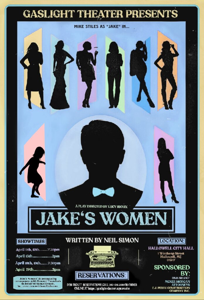 Sound Dylan WingGaslight Theater’s 2025 Season continues in April with Neil Simon’s “Jake’s Women”, directed by Lucille Rioux. The show will be produced at Hallowell City Hall Auditorium at 1 Winthrop Street in Hallowell over two weekends April 11, 12, and 18 at 7:30 PM April 13, at 2:00 PM, two shows on April 19th. 2:00 PM and 7:30 PM. Tickets are $15 for adults, $12 for students and seniors. Cash, check and credit card accepted at the door. For more information or to purchase tickets online using a credit card visit Gaslight Theater at www.gaslighttheater.org.
